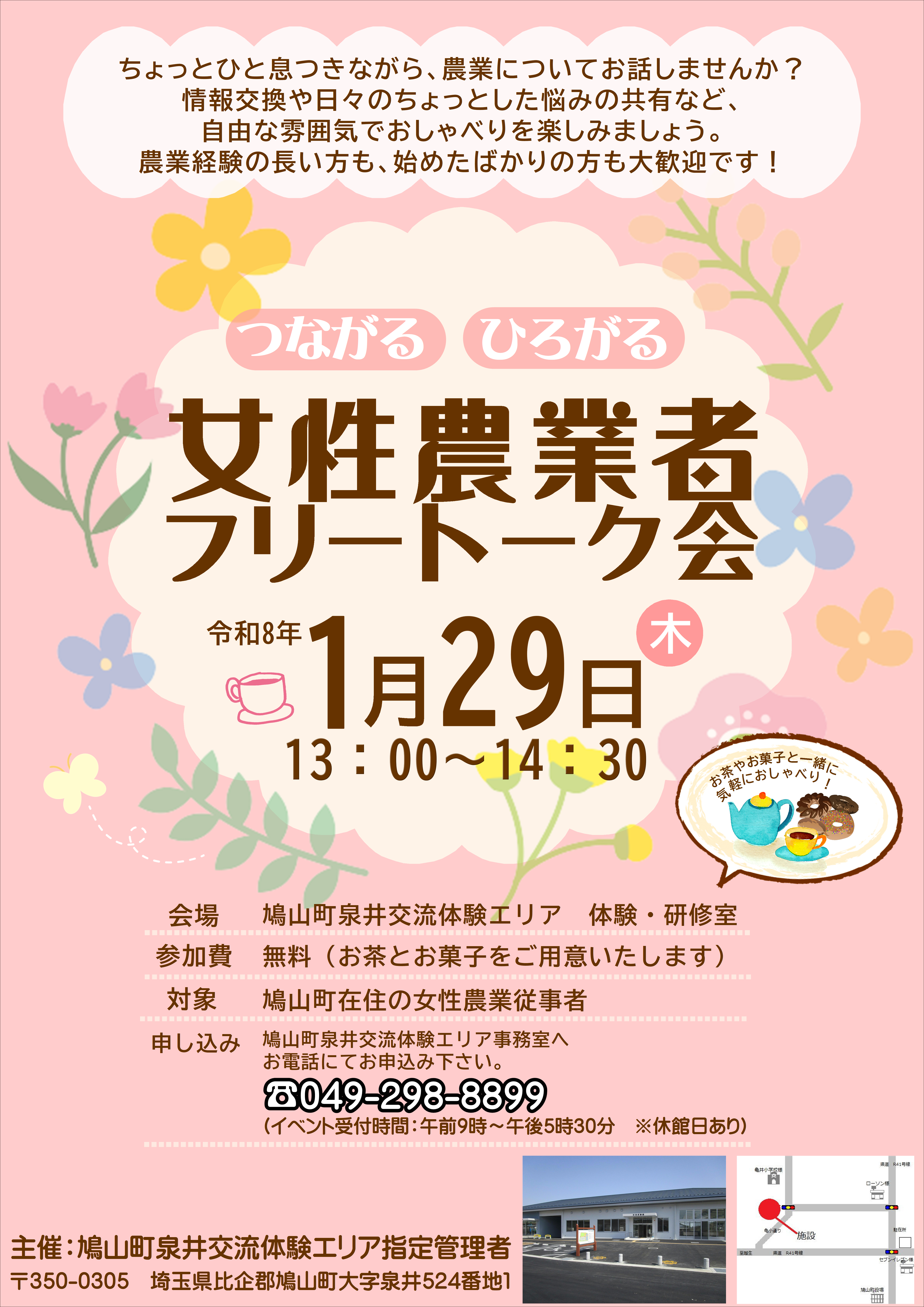 鳩山町在住の女性農業従事者の方たちで集まって、ほっとひと息つきながら農業についてお話ししませんか?