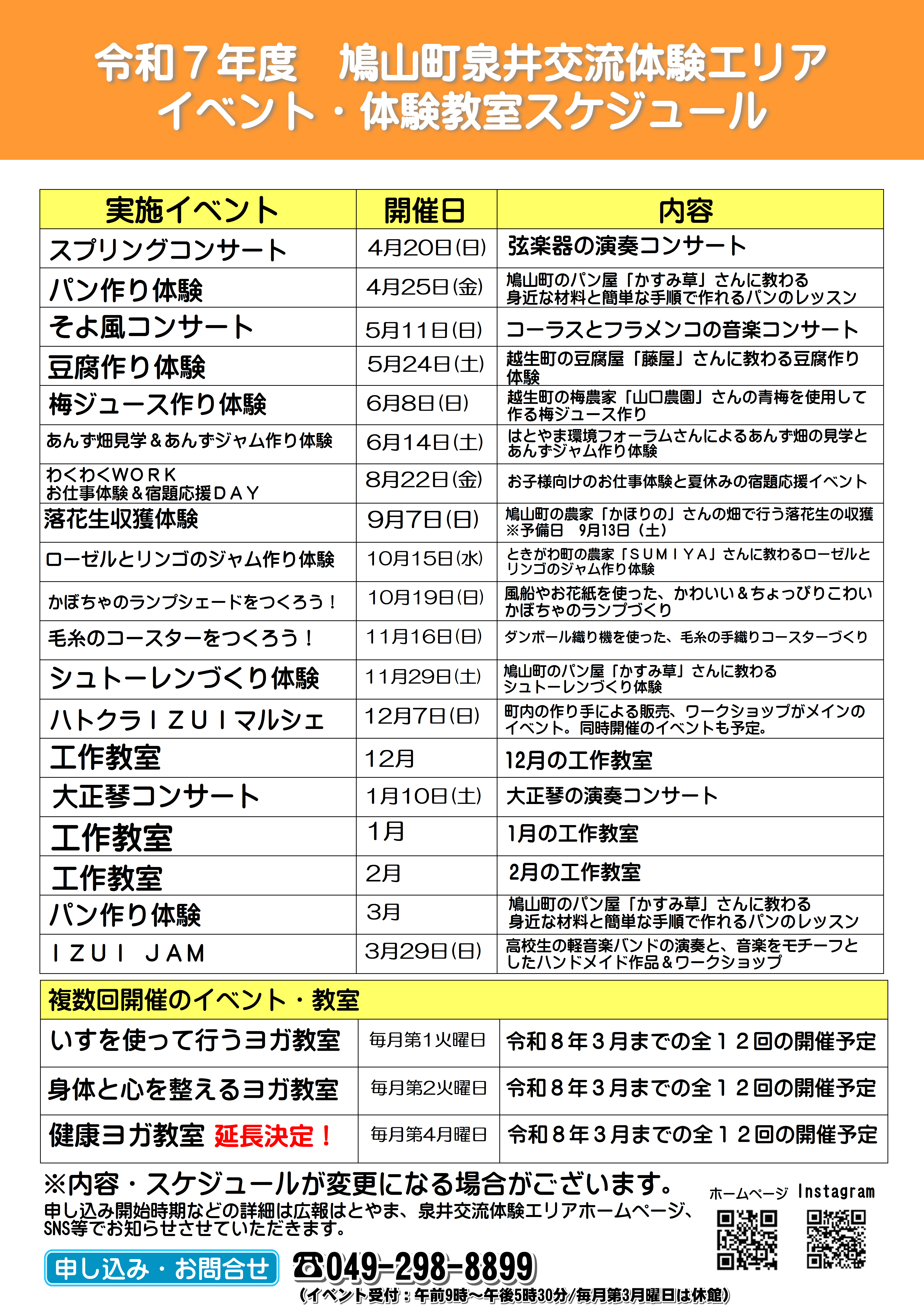 イベントの申し込み開始日などの詳細は、開催日が近づきましたら鳩山町泉井交流体験エリア ホームページやInstagram、Xでお知らせさせていただきます。