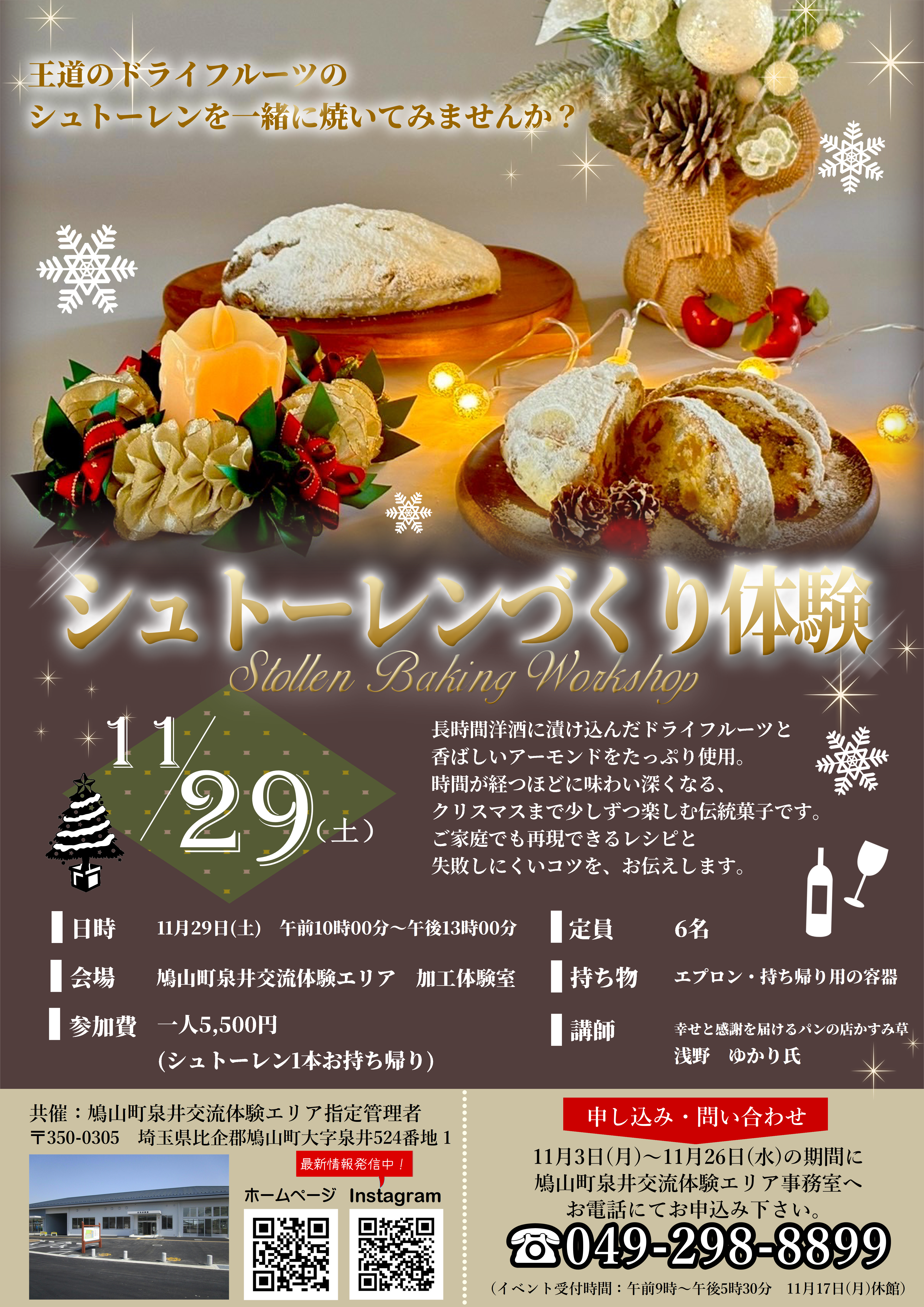 | 申込み | 11月3日(月)~11月26日(水)の期間に鳩山町泉井交流体験エリア事務室までお電話にてお申込みください。 ☎049-298-8899 (イベント受付時間:午前9時~午後5時30分/11月17日(月)は休館) |